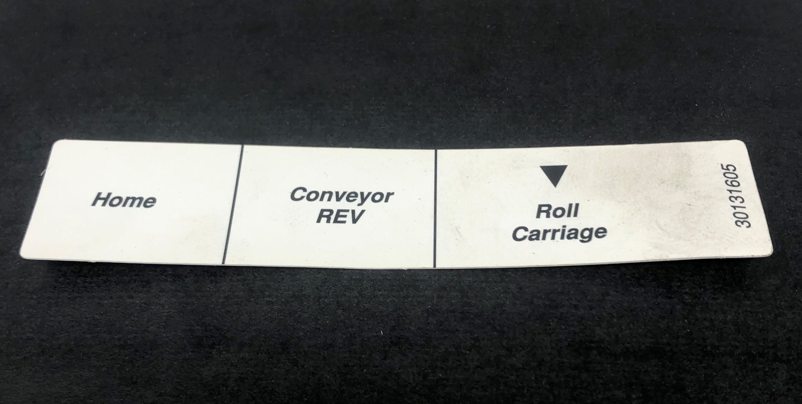30131605 – MEMBRANE INSERT 4.79 X 0.99 WHITE WITH BLACK TEXT 3 PANE [HOME] [CONVEYOR REV] [ROLL CARRIAGE DOWN]